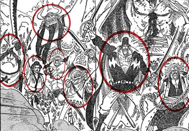 「あと1人の隊長は566話ラスト3コマ目でクリエル隊長とケツあごの隊長さんの間の人ではないかと思います。その間の人は553話の「さァ行くぞ」のコマや、562話の「『大将』1人に止められてんじゃねェ!!…」のコマで左端にいらっしゃったりしているのでもしかして・・・と思ったのですがどうでしょうか?」